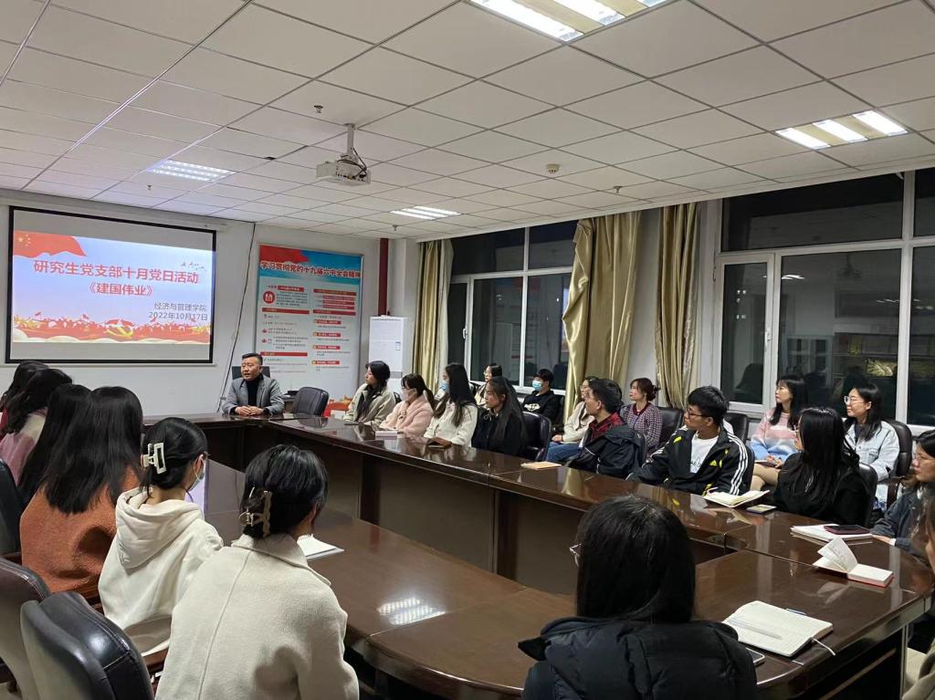 忆往昔峥嵘岁月,承不朽革命精神。为庆祝祖国第73个生日,重温建国历史,增进广大支部党员的责任感、荣誉感和使命感。2022年10月17日,经济与管理研究生党支部于逸夫楼南楼308会议室开展十月党日活动,此次党日活动的主题是:学习建国伟业,《领航》开启十月。会议由研究生党支部书记屈有明主持,会议第一项组织全体党员同志观看中央电视台大型专题片《领航》第一集,第二项由李宁、杨钰煊同志分享《建国伟业》主题报告。