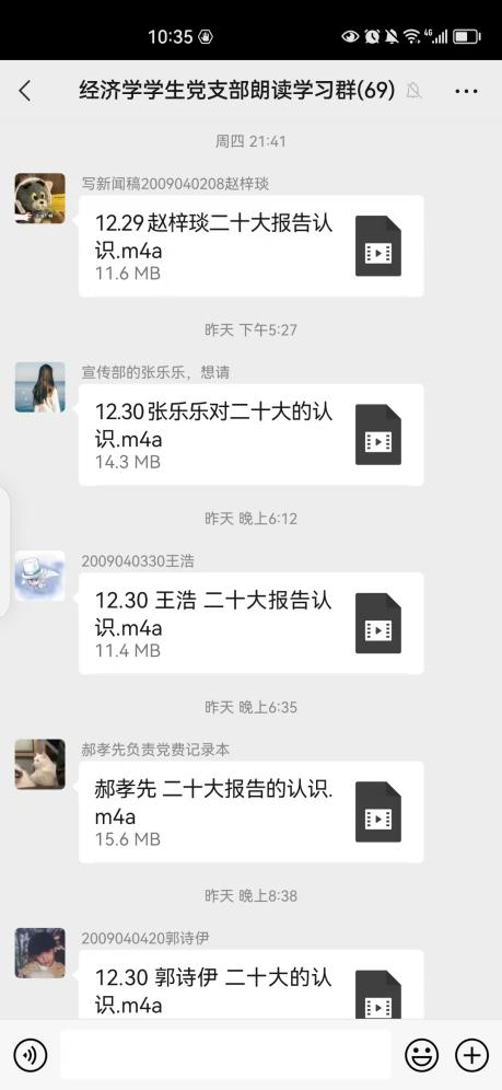 为了深入学习宣传贯彻党的二十大精神,深刻领会丰富内涵和精神实质,12月份经济学学生党支部开展“我读二十大”线上党日活动,全体党员用声音传递力量,以党的二十大精神为指引,踔厉奋发、勇毅前行,切实把学习成果转化为推动学生健康发展的不竭动力,让学生在朗读党的二十大报告中厚植爱党、爱国、爱社会主义的情感。