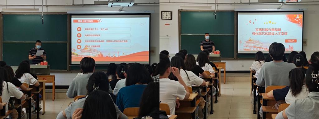 为深入学习贯彻习近平新时代中国特色社会主义思想,不断深化拓展党史学习教育,进一步教育引导广大新党员增强党员意识和党性修养,切实把思想和行动统一到学习贯彻党的二十大精神上来,2023年5月25日,管理学学生党支部在15301H组织开展以“实施科教兴国战略,强化现代化建设人才支撑”为题的教育活动。本次党课由管理学学生党支部青年委员孙瑞同志主讲。