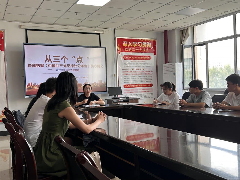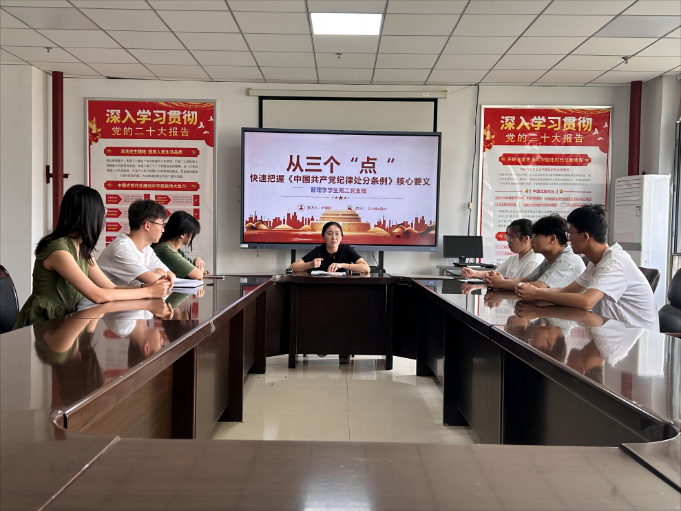 2024年6月25日,管理学学生第二党支部在院楼308党员之家开展学习会议:支部书记讲党课——《学条例明党纪,强党性践使命》。本次党课由党支部书记叶甜甜同志主讲,支部全体党员参加。