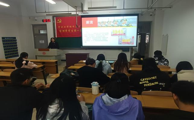 为深入传承抗战精神,凝聚民族复兴力量,进一步强化党员的历史使命感与责任担当,10月28号,管理学学生第一党支部于15108教室开展专题党课学习活动。党课以“铭记胜利荣光 勇担时代使命 迈向复兴征程”为主题,由支部党员付琦璐同志主讲,支部全体党员积极参与学习。