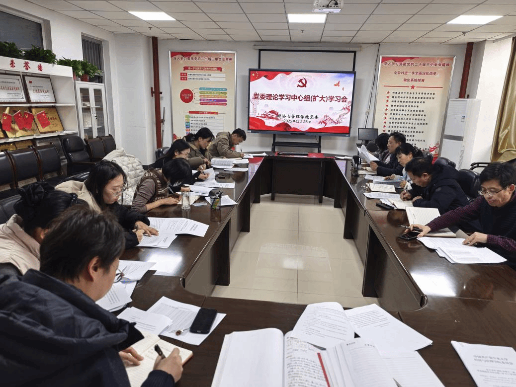 为进一步深入学习贯彻习近平总书记近期重要讲话及重要指示精神和党的二十届四中全会精神,落实校党委近期党建工作安排,12月26日下午,经济与管理学院党委于学院308会议室召开院党委理论学习中心组(扩大)学习会,学院领导班子、党委委员及各党支部书记参加会议,会议由学院党委书记杜苇主持。