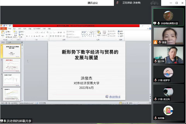 首先,赵公民院长代表经济与管理学院对洪俊杰教授表示欢迎和感谢。随后,洪教授从世界经济概况出发,分析了当前世界经济的新形势与新方位,分别从经济动能不足、老龄问题严重、投资信心匮乏、创新能力不足、收入分配不公、贸易失衡持续、不确定性剧增这几个方面说明当前的世界经济压力,再加上对中国在世界经济中的位置以及拜登经贸政策的分析,提出中国应对外部压力的方式之一便是“做好自己”。洪教授重点介绍了数字经济与贸易,根据国家大会和经济政策提出数字化及数字经济潜力巨大,需引起高度重视。洪教授向大家讲述了数字贸易发展中的多个分歧和共识,并对数字贸易发展的焦点、难题等方面进行深入分析。