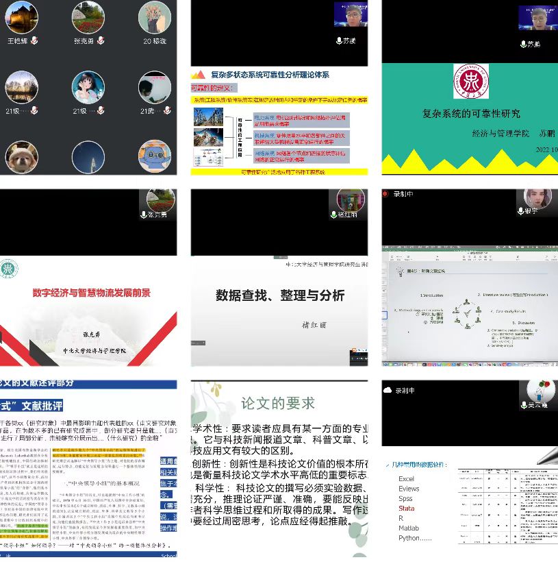 根据学校和学院防疫工作安排,同时为了确保研究生学位论文开题、中期考核以及学位论文预答辩等培养工作的顺利进行,10月3-7日,经济与管理学院在线举办了研究生学术讲座。此次讲座由科研副院长张克勇教授主持,邀请学院研究生导师朱美峰、宣善文、武勇杰、张克勇、邵延君、褚红丽以及近三年新入职的教师苏鹏、吴云霞、银宇担任主讲人,研究生参加人数近百人。