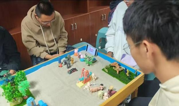 活动开始,李老师先带领各位同学感受海沙的柔软,并进行沙盘活动规则的讲解。讲解完毕,由每位同学各自选择指定数量的沙具来开启自己的沙盘创作,创作结束后由李老师带领大家分享自己的内心感受。活动中,同学们自由发挥,使用沙具构建代表个人内心世界的沙盘。沙盘布置完成后,大家就各自的沙盘各抒己见,分享了不同的故事。在彼此的交流中,同学们的内心逐渐拉近。这种交流不仅释放了情感压力,也增进了彼此的理解。沙盘活动结束后,李老师还带领大家进行了“凑钱币”“不倒森林”和“心有千千结”等团体辅导活动,进一步促进了我们对内心世界的深入理解,并有效提升了我们的情商及情绪管理技能。