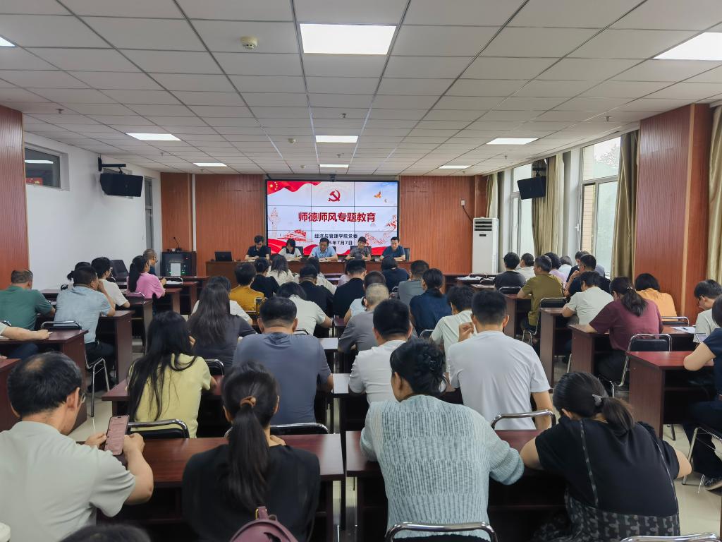 为进一步深入学习贯彻党的二十大、二十届三中全会精神和全国教育大会精神,全面贯彻习近平总书记关于教育的重要论述,扎实推进深入贯彻中央八项规定精神学习教育,加强学院师德师风建设工作,根据校党委关于开展“弘扬践行教育家精神——师德建设行动”的实施方案的相关要求,经济与管理学院于7月7日上午,在学院301会议室召开师德师风专题教育大会,学院领导班子及全体教师参加会议,会议由学院党委书记杜苇主持。