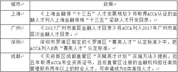 落户优先:根据上海市发布的《上海金融领域“十三五”紧缺人才开发目录》,ACCA 人才在离岸金融,保险业务,租赁业务,担保业务中都能发挥优势,持有 ACCA 的财会人才被明确认定为金融紧缺人才可享优先落户权限福利。