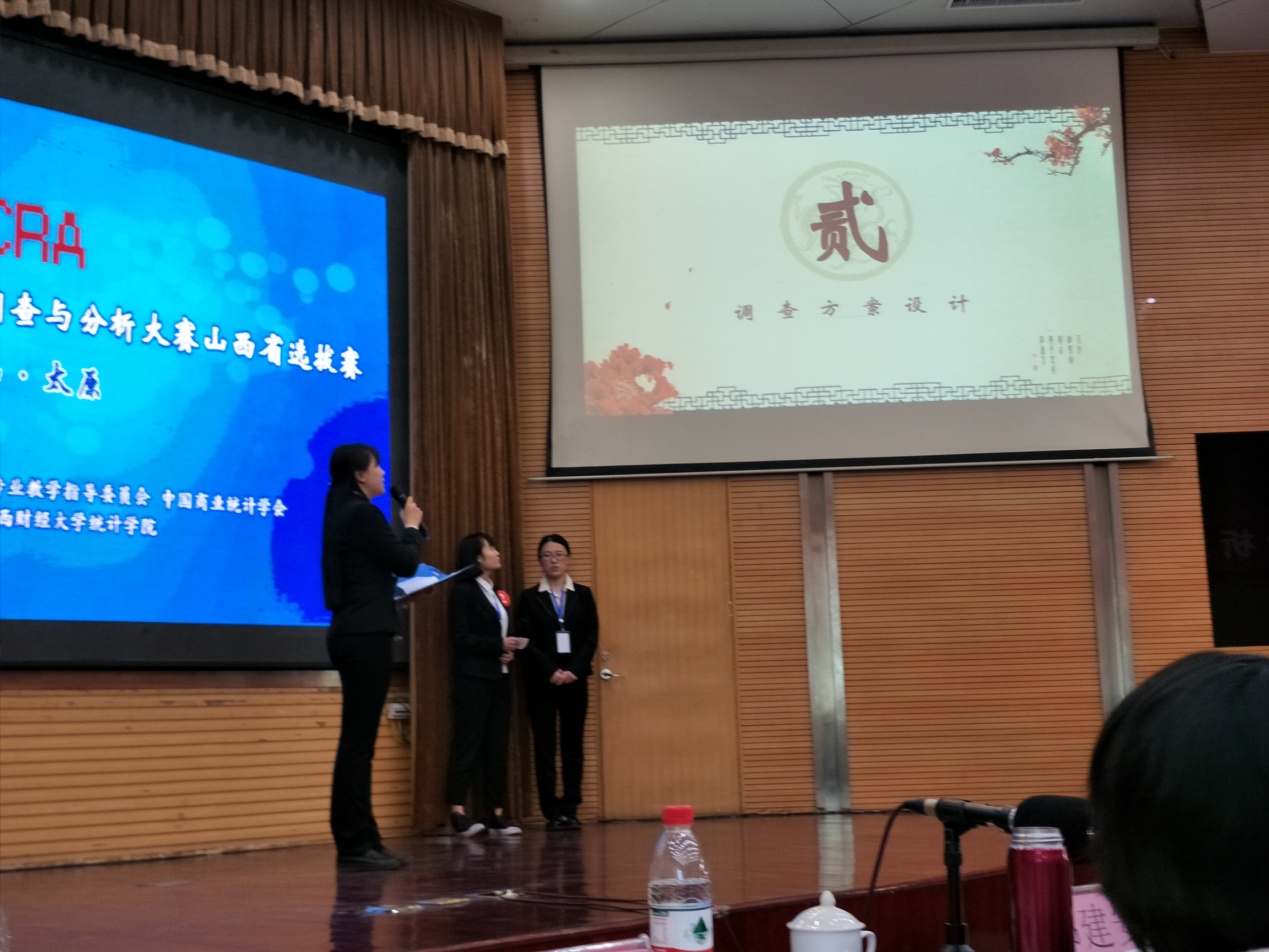 2017年4月22日,由教育部高等学校统计学类专业教学指导委员会与中国商业统计学会共同主办,山西财经大学承办的“第七届全国大学生市场调查与分析大赛山西赛区选拔赛”成功举办。全国大学生市场调查与分析大赛自2010年启动以来,参加院校和学生越来越多,是政府支持、企业认可、高校师生积极参与、海峡两岸高度联动的统计学科实践教学平台。共有的25支队伍参加了此次比赛。来自省内各高校年轻学子在充满激情地互相竞争的同时,开拓视野,学习交流。省赛过程中,我校选送的六支队伍参赛同学都精神饱满,充满感染力地展示了自己项目;现场答辩环节,面对评委老师专业而尖锐的问题,参赛同学从容淡定,表现专业机智。我校学生的优异表现,得到来自政府、研究机构、数据分析企业评委们的高度赞赏。经过激烈角逐,我校选送的《雾霾不要亲吻我——3M防雾霾口罩太原市大学生市场调查》、《青龙古镇游客满意度调查》获得省赛一等奖,其他队伍分获二等奖和三等奖。