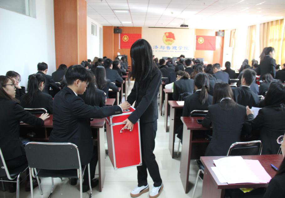 开幕式结束后,学生代表和领导移步楼下合影留念。稍作调整,经济与管理学院第三届团员代表大会正式开始,本次会议应到代表110人、实到代表98人,超过代表人数的三分之二,故可以召开。此次会议设有总监票人一人,监票人两人,计票人两人。随后,大会主席团成员许彤宣读监票、计票人员名单,主席团成员于子翔宣读选举方法,主席团成员丁诗颖宣读团委委员会候选人名单及简历,主席团成员靳鹏超宣读上级团代会候选人名单及简历。宣读完毕后,总监票人检查监票箱,监票、计票人发放选票,总监票人宣布选票发放情况,各位代表开始投票。