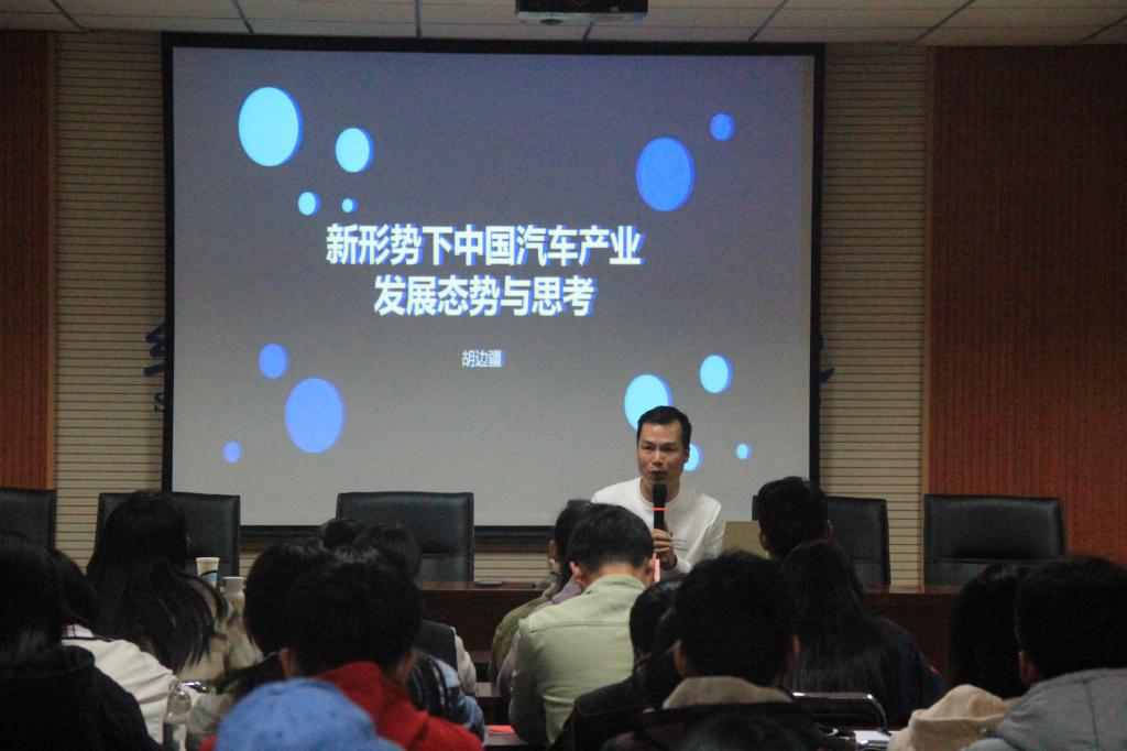 为激发经济与管理学院学生了解更多社会时势的热情,正确考虑以后的就业方向,我院有幸邀请到中南大学工商管理专业博士,高级工程师,高级经营师,高级策划师,湖南猎豹汽车股份有限公司董事,副总裁,著名企业家胡边疆先生于2019年11月8日晚上七点在逸夫楼301为我院学子带来一场关于新形态下中国汽车行业的发展态势与思考的讲坛。