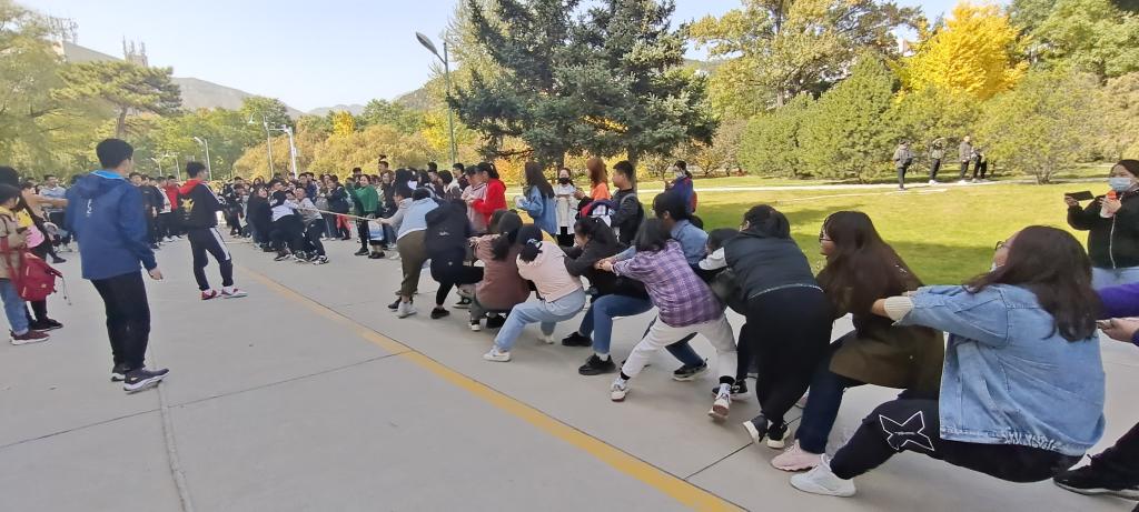 10月 23日中午12点20分 ,各班比赛队员早早的到了指定场地。他们脸上洋溢着信心,摩拳擦掌,积蓄着力量,等待着大展身手。随着哨声吹响,双方队员都使尽全力紧紧拽着绳子,往自己身后拉。旁边的同学也融入其中,用力喊着加油, 辅导员也在一旁为队员助威,场面非常热闹。比赛初期,四班就崭露头角,实力非凡。二班和八班僵持不下,久久不能决出胜负,最终大局已定。二班战胜了八班,获得第一名。 八班和四班分别取得了第二名,第三名的成绩。