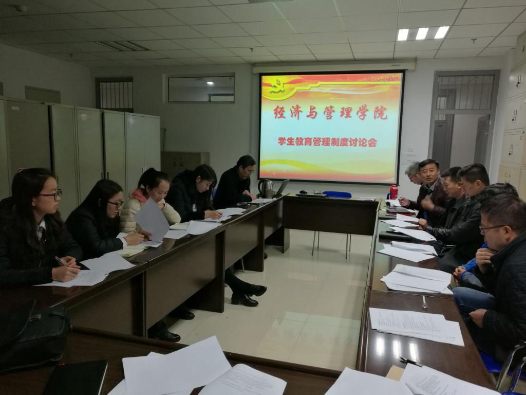 11月8日下午5点,经济与管理学院在逸夫楼5层档案室召开了学院学生教育管理制度讨论会,学院党委书记石薛桥出席会议,党委副书记屈有明主持会议,全体辅导员和班主任参加会议。