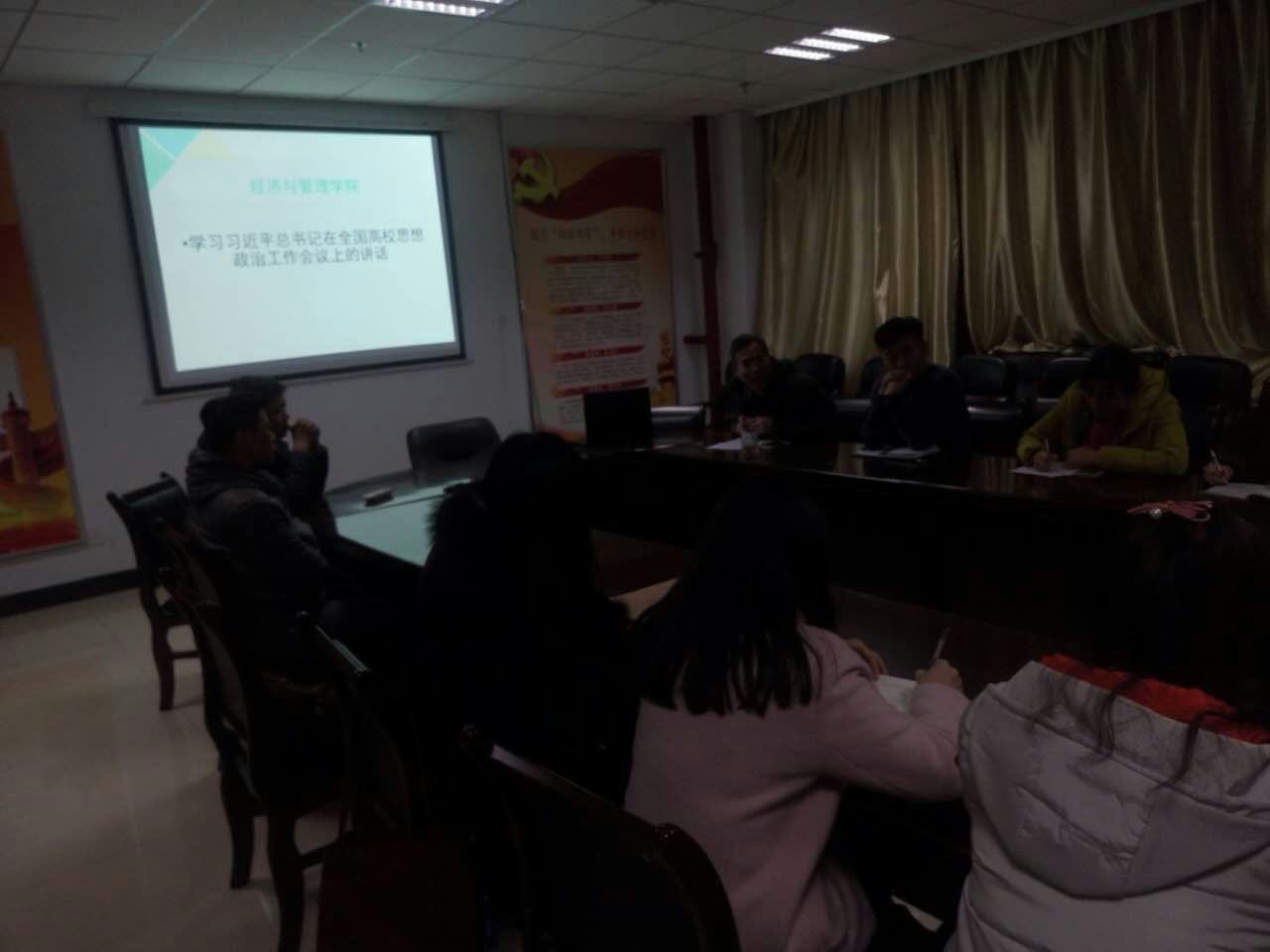 2017年1月4日上午10点,经济与管理学院在逸夫楼南楼308会议室组织全体辅导员和班主任学习了习近平总书记在全国高校思想政治工作会议上的讲话。院党委书记石薛桥出席会议,院党委副书记屈有明主持会议。全体辅导员和班主任参加会议。