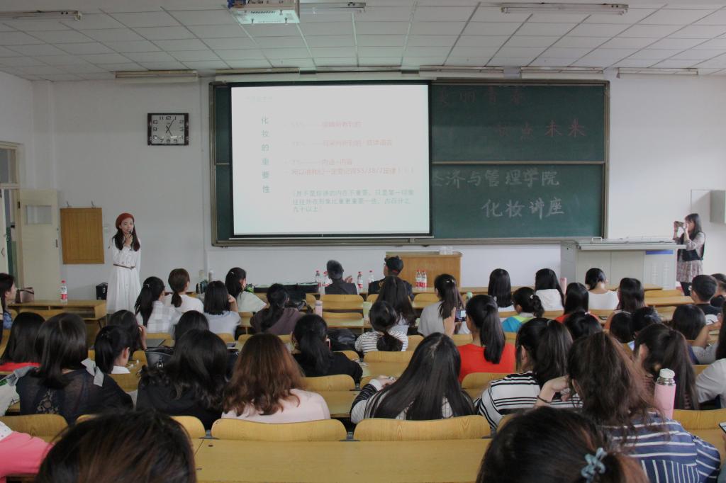 9月26日下午5点,由经济与管理学院举办的“美丽青春,妆点未来”化妆讲座在08302H教室开展。本次讲座特别邀请小乐造型时尚集团高级化妆讲师要文君老师和高级美发讲师蒋龙老师来我院讲授如何打造专业的职场造型。即将走向职场的大四同学参加讲座。
