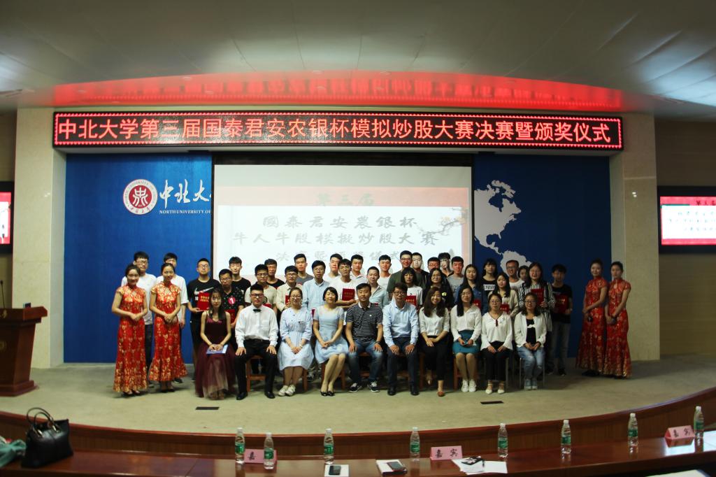 5月29日下午3点,中北大学第三届国泰君安农银杯牛人牛股模拟炒股大赛决赛暨颁奖仪式在瑾瑜国际会议中心举行。校团委副书记刘玉巍、经济与管理学院党委副书记屈有明、团委书记那鹏飞、经济学学科部副主任周娟美、国泰君安并州北路营业部总经理刘泽、部门经理张涵以及我院部分团委学生会干部出席了本次活动。