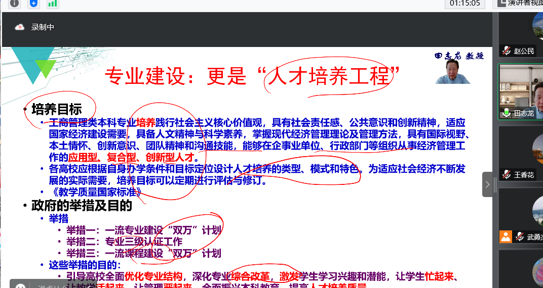 田志龙教授围绕“一流专业建设”的主题,从“高质量本科人才培养”、“一流专业建设点的建设”、“一流专业建设-从规划到落实”等三方面提出自己的见解。(1)关于“高质量本科人才培养”,田教授指出要始终坚持“二性一度”的金课理念,并将其落实在管理类核心课程中,同时强调本科教师应熟悉“学习理论”以便对学生因材施教。(2)关于“一流专业建设点的建设”,田教授指出专业建设要以“培养人才”为出发点和终点,突出“以学生为中心、结果导向、持续改进”的OBE教育理念。(3)关于“一流专业建设:从规划到落实”,田教授指出国家一流本科专业建设应有一个三年规划,并列举目标结果清单,持续改进。