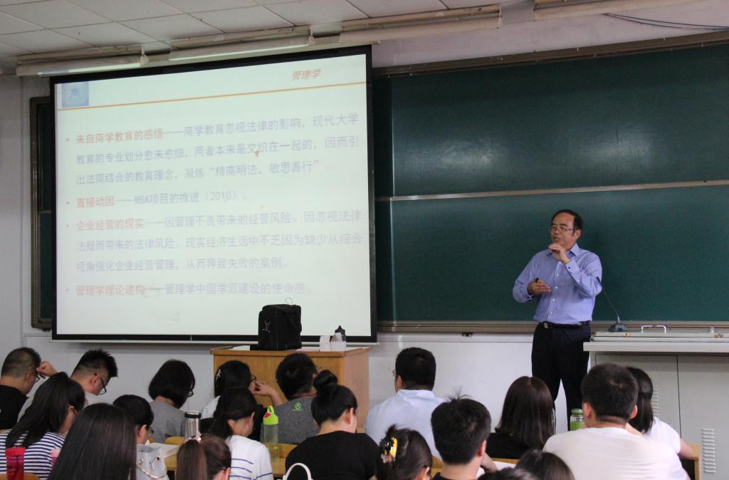 讲座现场座无虚席、过道和走廊都站满了赶来聆听讲座的学生。柴小青教授首先热情问候了在场师生,随后以“法商管理理论构建的现实需求及逻辑基础”为主题开展演讲。他围绕法商管理理论提出的背景、具体概念、基本观点以及法商管理的发展应用等四个问题进行深入,着重强调法律对经济管理工作的重要意义。他还通过分析大量案例来说明法商管理的研究重点、应用实践以及法商管理人才培养等课题研究的方向,拓宽了同学们的视野。同时,柴教授还着重强调"树德"的重要性,告诫在场学生提高自己的道德修养,培养正确的人生观、价值观。